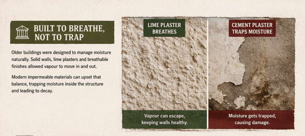 Older buildings weren’t sealed tight—they were designed to manage moisture naturally.