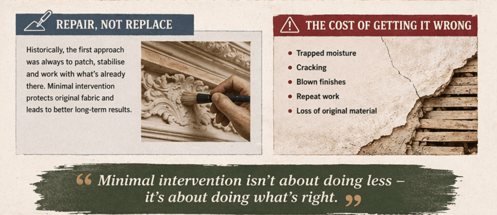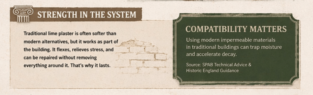 One of the biggest misconceptions is that older plasterwork survives because it’s “harder” or “stronger.”