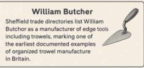 By 1825, Sheffield trade directories list William Butcher as a manufacturer of edge tools including trowels.