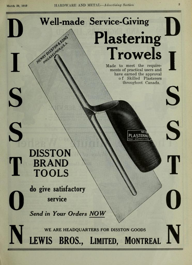 In the early twentieth century, Henry Disston and Sons in the United States branched into trowel production. By 1910 to 1919, Disston issued dedicated trade booklets showing plastering and brick trowels. These catalogues prove that Disston actively marketed these tools, possibly into the UK through distributors such as Buck and Hickman or Rollins and Sons.