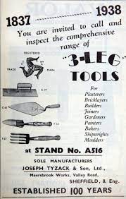 By the interwar years, plastering trowels were firmly established in industrial supply chains. The 1934 WHS Export Catalogue explicitly lists plastering trowels, providing the earliest unambiguous printed confirmation of these tools in the UK. By 1938, Buck and Hickman Catalogue No 11 included plasterers tools under masonry trades, highlighting the role of major distributors. Spear and Jackson and Tyzack catalogues from 1939 and 1940 feature multiple plasterers trowels, including Tyzacks Centenary Trowel. By this period, plastering tools had become standardized products with identifiable brands, steel blades, and wooden handles.