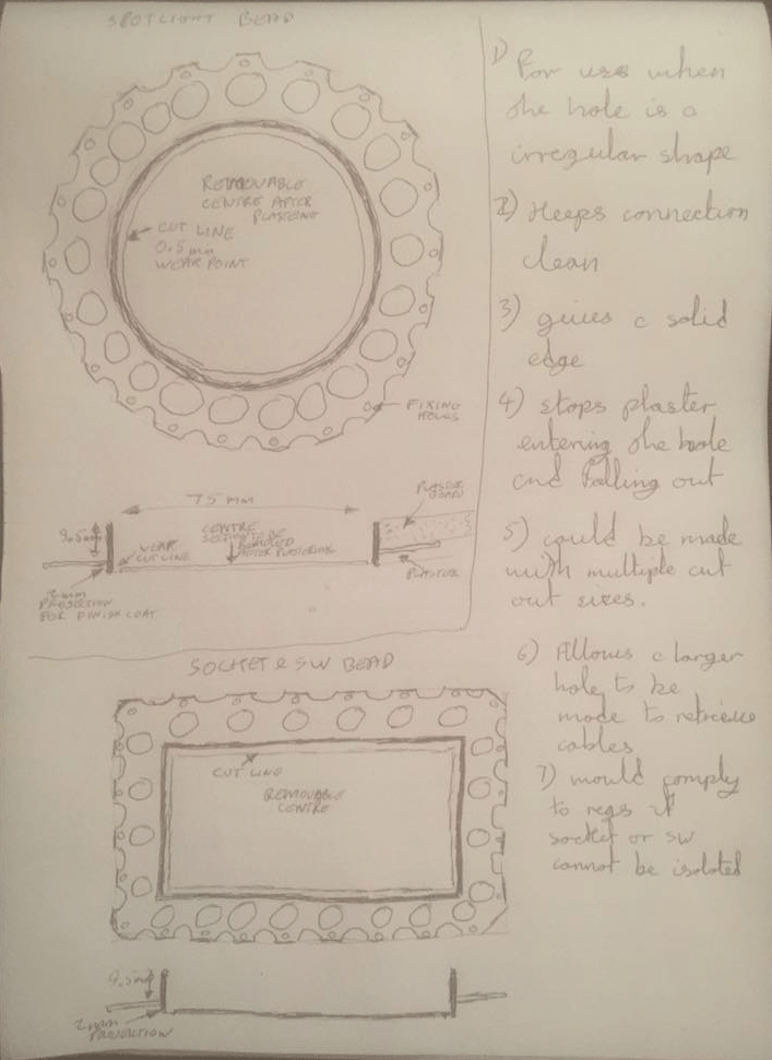 It was not long before he put pencil to paper and came up with some rough ideas of how to overcome the problem, after several sketches had been drawn Peter then approached an injection moulding company, they made a CAD drawing and once approved they made several 3D printed versions, after a few trial tests they came up with the finished ceiling socket bead, and later the wall socket bead, a video of the socket beads in use was made then uploaded to YouTube