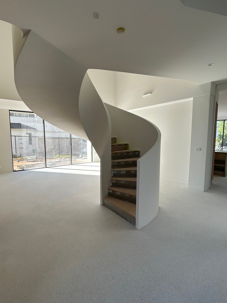 Architectural curves are another major specialty. Curved or helical staircases in particular, including both the visible walls and the undersides of stairs, involve a high level of geometry, problem-solving, and patience. I’ve worked on large multi-storey curved staircases where every surface had to flow cleanly and finish to a very high standard. That sort of work is still relatively uncommon in our region, and it’s something I take a lot of pride in getting right.