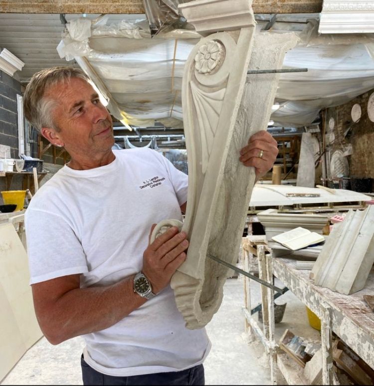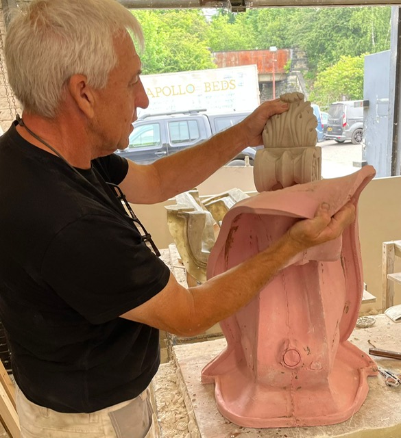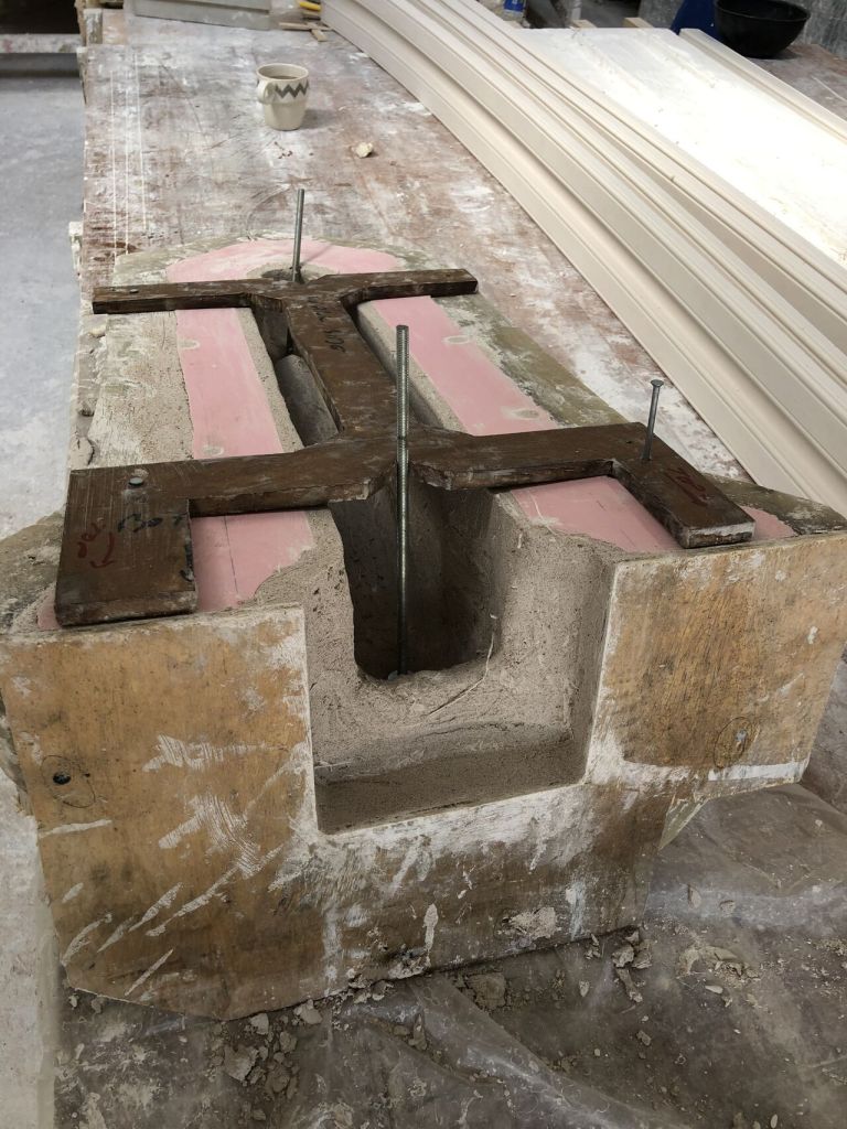 Hand/cast brackets (large corbels) in Jesmonite (dolomite stone) for an external project showing the ‘jig’ used on the back for setting the SS rods for the install where we used 2-pack resin
