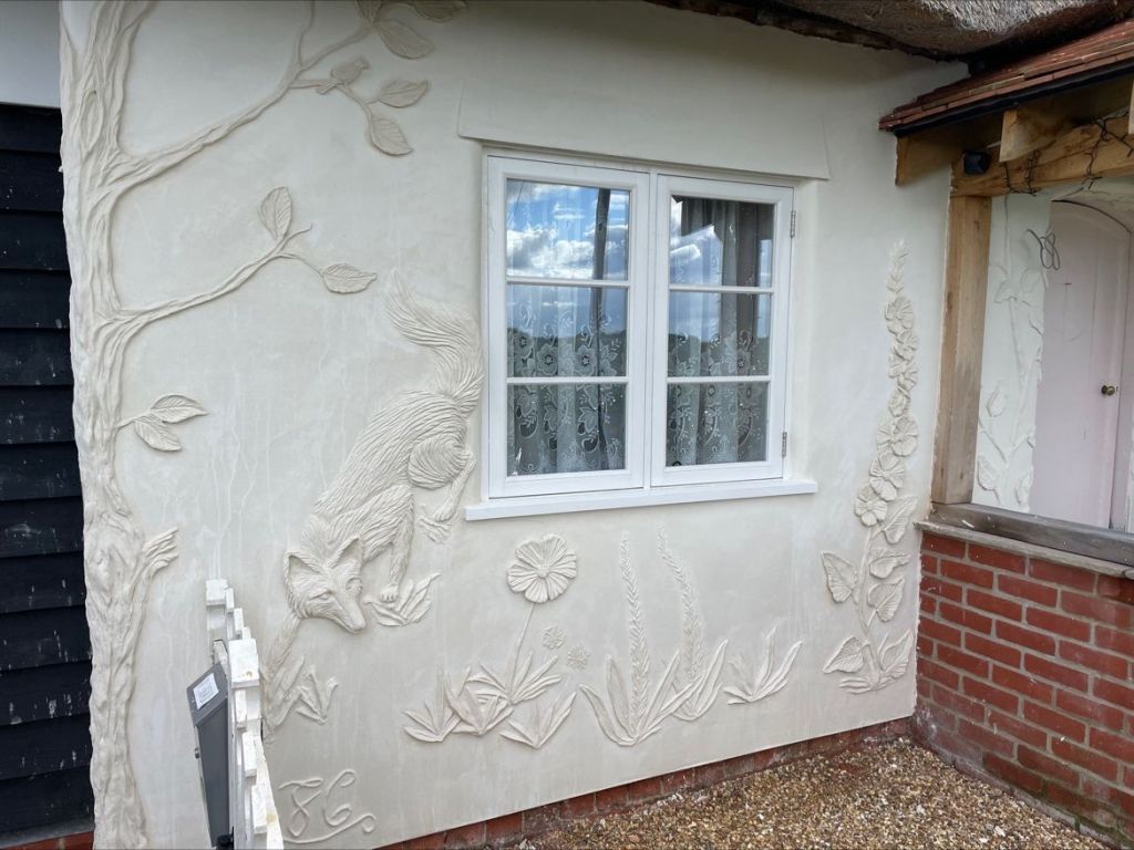 Went self employed in 1991, and started my own small building company in 2000, while renovating my own clay lump property I discovered the traditional art of Pargetting in lime plaster, and fell in love with the skill, I’ve since stopped building and now concentrate on Pargetting, sculpting (bas relief) and also my artworks which are available in some local art galleries.