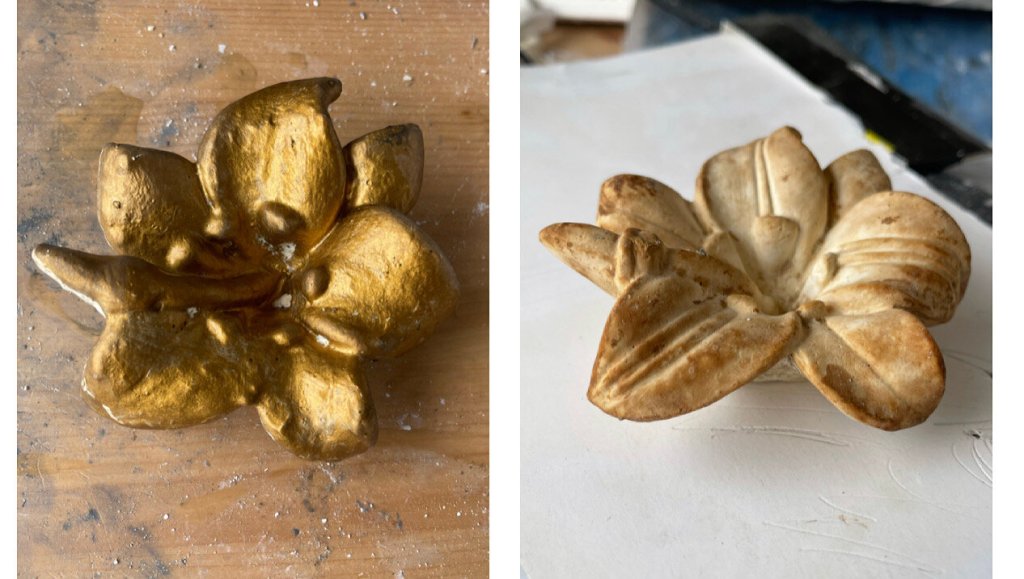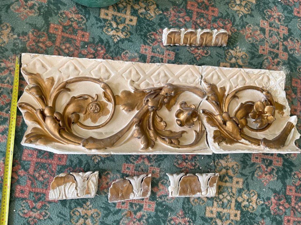 Salvaged the enrichments (patterns) to be reproduced at the workshop Floral enrichment cleaned off layers of paint – prep prior making new rubber mould