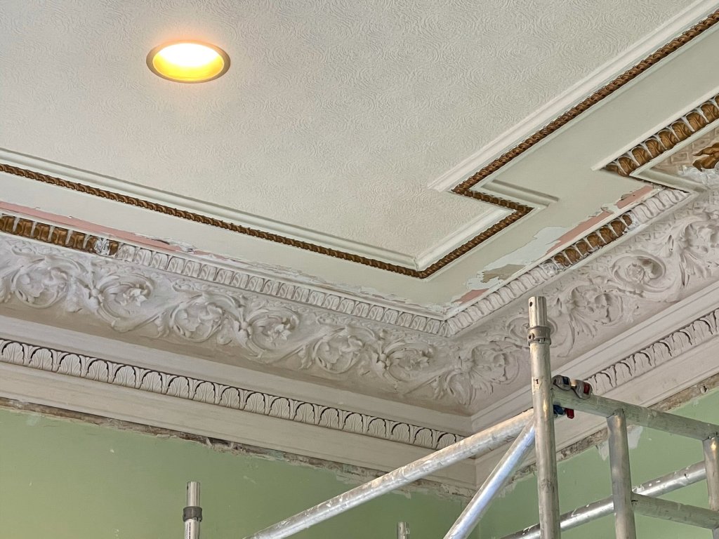 We have won the project to restore large ornate cornice (proper term for coving) at Royal Hotel Scarborough at Scarborough, North Yorkshire as the room is served as for weddings , overlooking to the beach. Ceiling is 4.7 meters high. See below the progression pictures of affected sections where got damaged from water ingress from above.