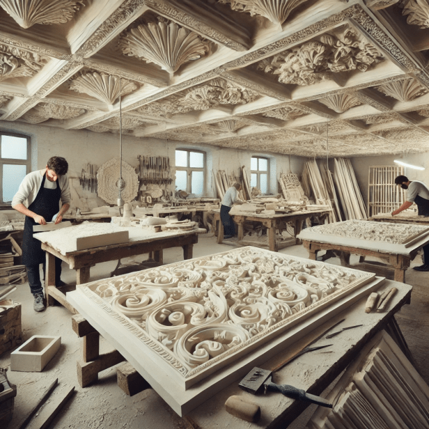 The breakthrough came in the 1850s when French plasterer Léonard Desachy developed a way to reinforce plaster with hessian and lightweight frameworks. This allowed decorative elements to be prefabricated and then installed on-site, making them lighter, faster to produce, and more consistent in quality.