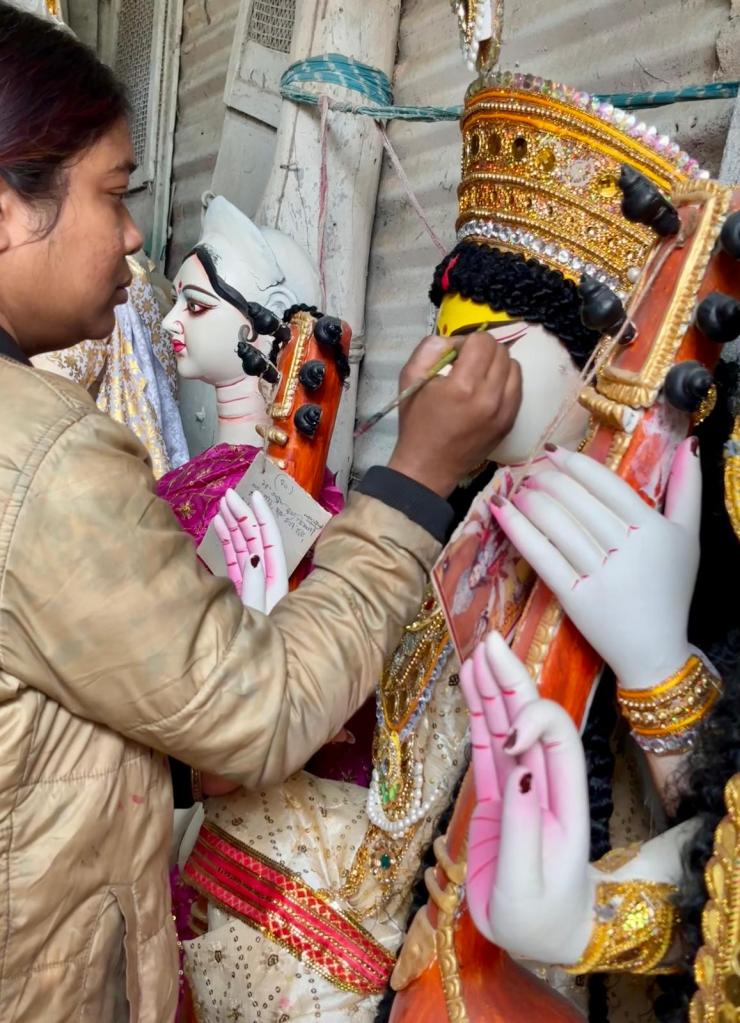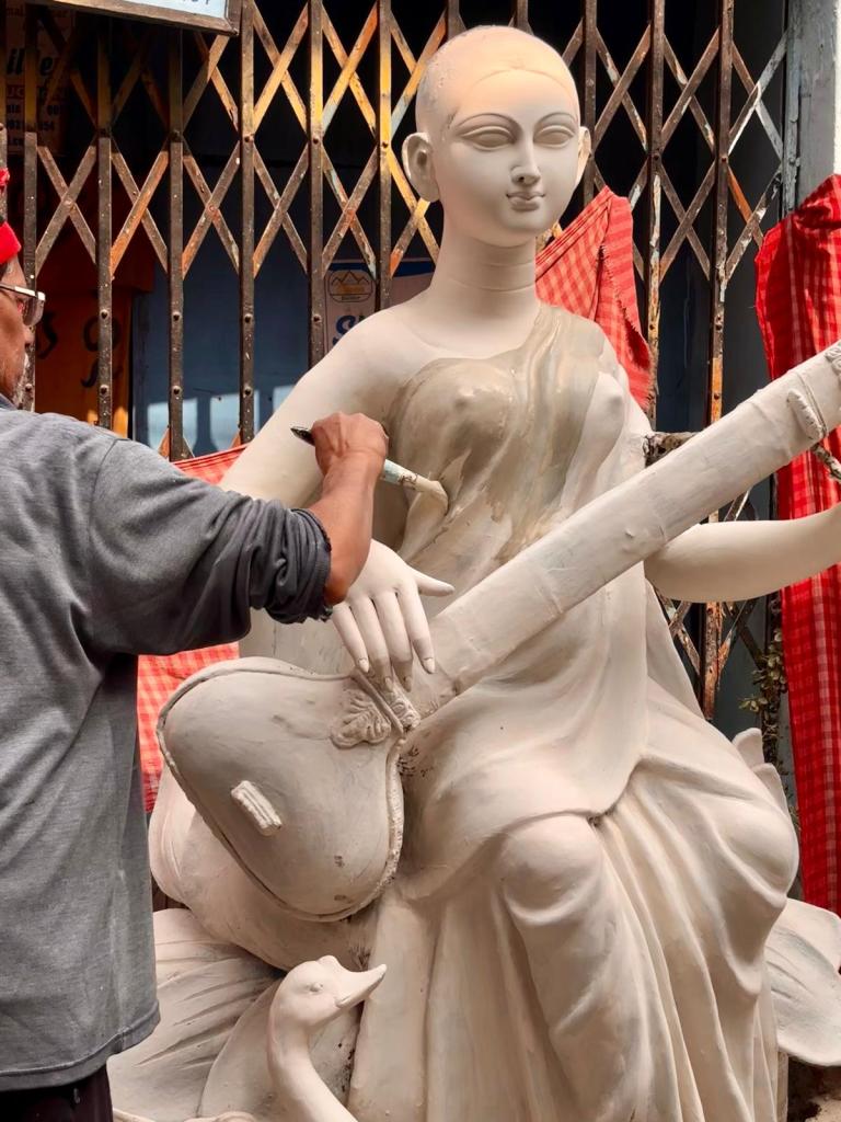 Hair is usually added to the idol, often using black jute fibre or sometimes real human hair! stuck on with natural resin or wax. Clothing made of cotton or silk fabric is draped and glued directly onto the body. Crowns, necklaces, musical instruments and weapons are crafted separately by specialist makers. Common materials include lightweight sholapith known for its lightweight (which is easy to carve or mould into shape to form elaborate crowns or headgear), gold and silver-coloured foils, beads, sequins, and tiny mirrors.
