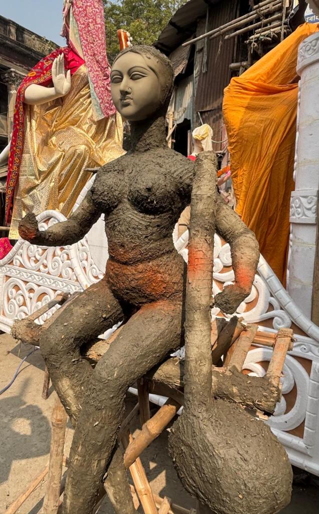 Everything begins with a light internal structure made from bamboo sticks and pieces of wood. This frame sets the idol’s basic proportions, pose, and balance of the idol. Once it’s built, bundles of straw are tightly tied around it to add volume and give the clay a solid background. Getting this stage right is critical; it lays the foundations of how the finished figure will look and stand. River clay is then applied in several coats. The first rough layer usually has chopped straw mixed in; it builds up the main body shape and bulk quickly. The figure is left to air-dry slowly, preferably in a shaded and well-ventilated spot. Rushing this step can cause deep cracks or warping. As each coat starts to dry (and inevitably shrinks a little), small cracks appear; these get filled and smoothed with the next slightly finer mix. The final coat is made from very finely sieved clay, perfect for the final shaping of delicate details: facial expressions, fingers, jewellery patterns, and drapery folds, all done with simple wooden or metal hand tools.